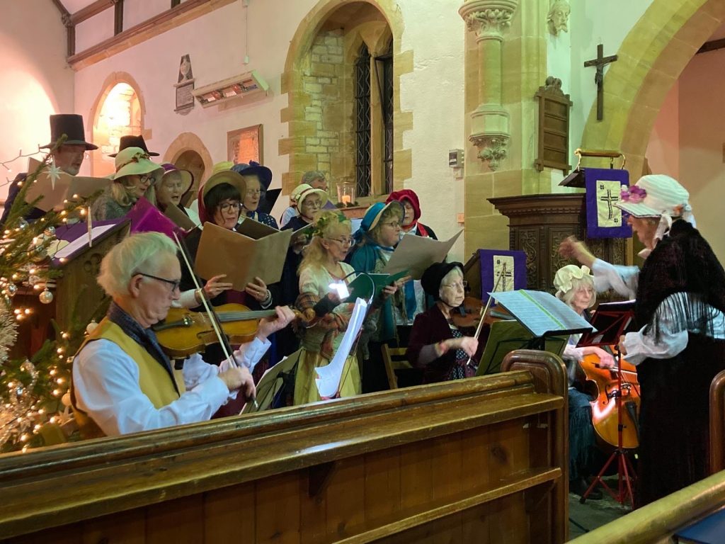 An (occasionally) costumed quire (mainly WG) meeting fortnightly on Tuesday evenings at 7.30 pm throughout the year, except August. The Quire meets in Comrades Hall, Broadwindsor for practices and socialises afterwards in the White Lion which is a community run pub. Practices are open to visitors and membership is open to all. We perform infrequently, but are focused on the local community, e.g. Harvest Supper, church services and pub carols on Twelfth Night. See the quire’s website for more information.